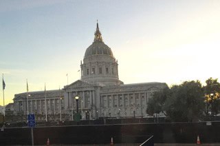 On returning to the ship it was time to get ready for the World Cruise Gala Dinner. It was a formal affair, and we were all to meet in the Queens Room at 5:45 to have drinks, and be assigned a bus to take us to the venue. The dinner was held at the San Francisco City Hall. This is a magnificent large building, look rather like a state capitol with large columns and a dome that glowed in the fading sunlight. There were more drinks to be had in the entrance hall, and then we were escorted into the banquet hall. This was a large room looking like any old banquet hall, but they had done a good job with the lighting and table settings, so it did have too much of a big room feel.