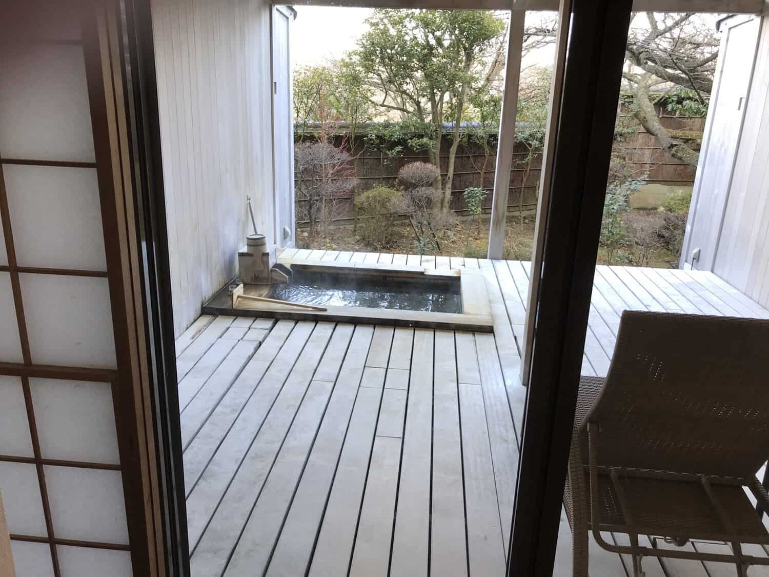 Then it was time for our first onsen experience. We had booked in to Gora Sounkaku for the night. On arrival we removed our shoes, had a cup of tea, and were shown to our room. We changed into yukatas, and sat on the floor on flat floor chairs that were the only furniture in the room apart from a low table. We were looking forward to dinner, but began obsessing about the correct way to sit on the floor when you are eating, and how on earth we were going to be able to sit on the floor for a prolonged period of time during the meal. With great difficulty we managed to get up off the floor, and headed outside to our very own private spring fed soaking bath to further contemplate the issue.