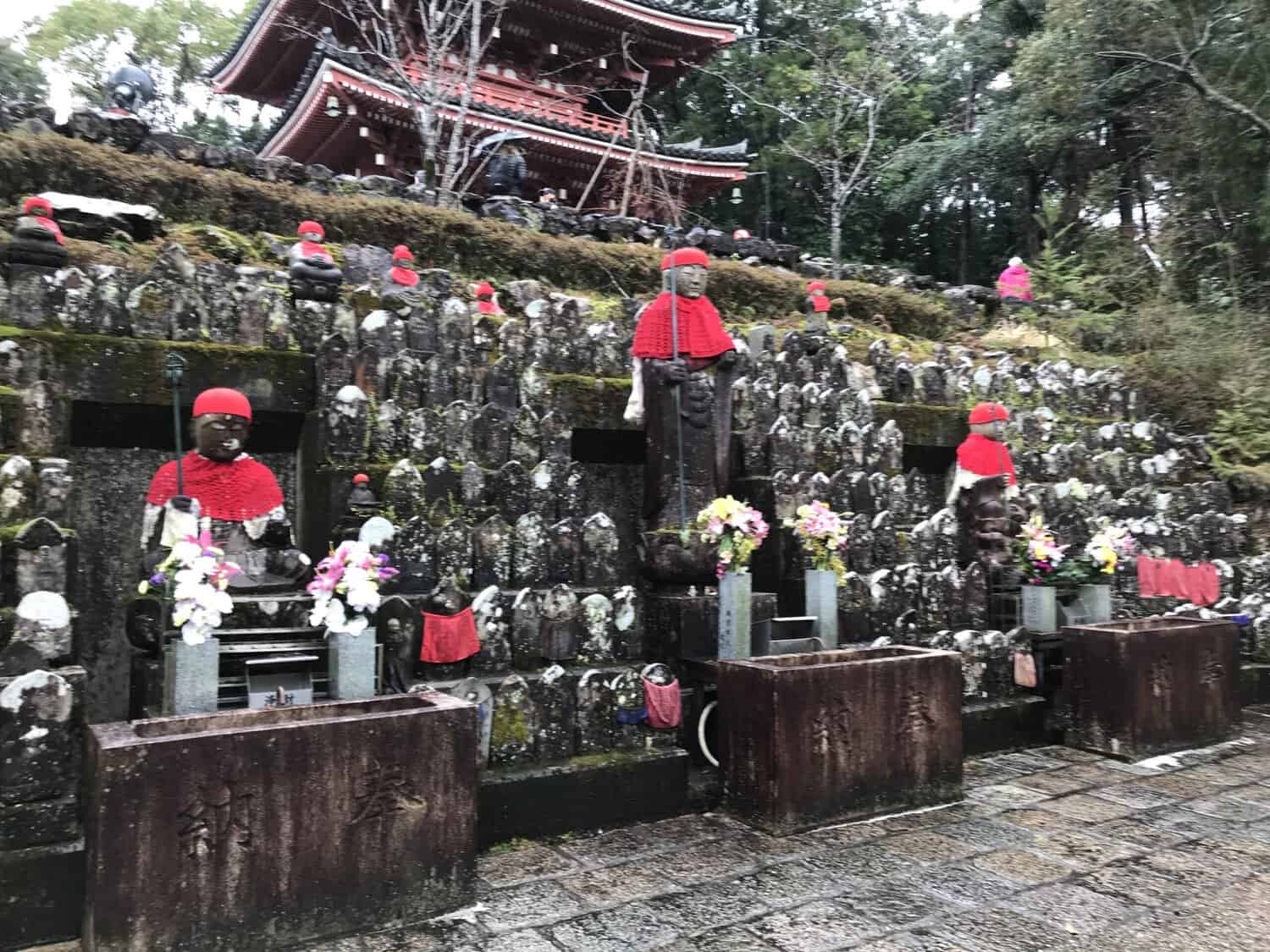Our first stop was the Chikurin-ji Temple which dates back to the 8th century and forms part of the Shikokuk 88 temple pilgrimage. This is Japan’s most famous pilgrimage route according to our guide. To get there you have to walk down the road from the bus parking area in the rain, and then up several flights of uneven slippery stairs, but it is worth the climb. The pagoda at the top is really beautiful, and the treasure hall full of lovely treasures. However, the most interesting part of the temple is the little Buddhas scattered around the grounds, each wearing red crochet bibs. The Buddhas are made of gray stone, and the sky was a dark gray, but the little red crochet bibs really stood out, making a somewhat surreal sight.
