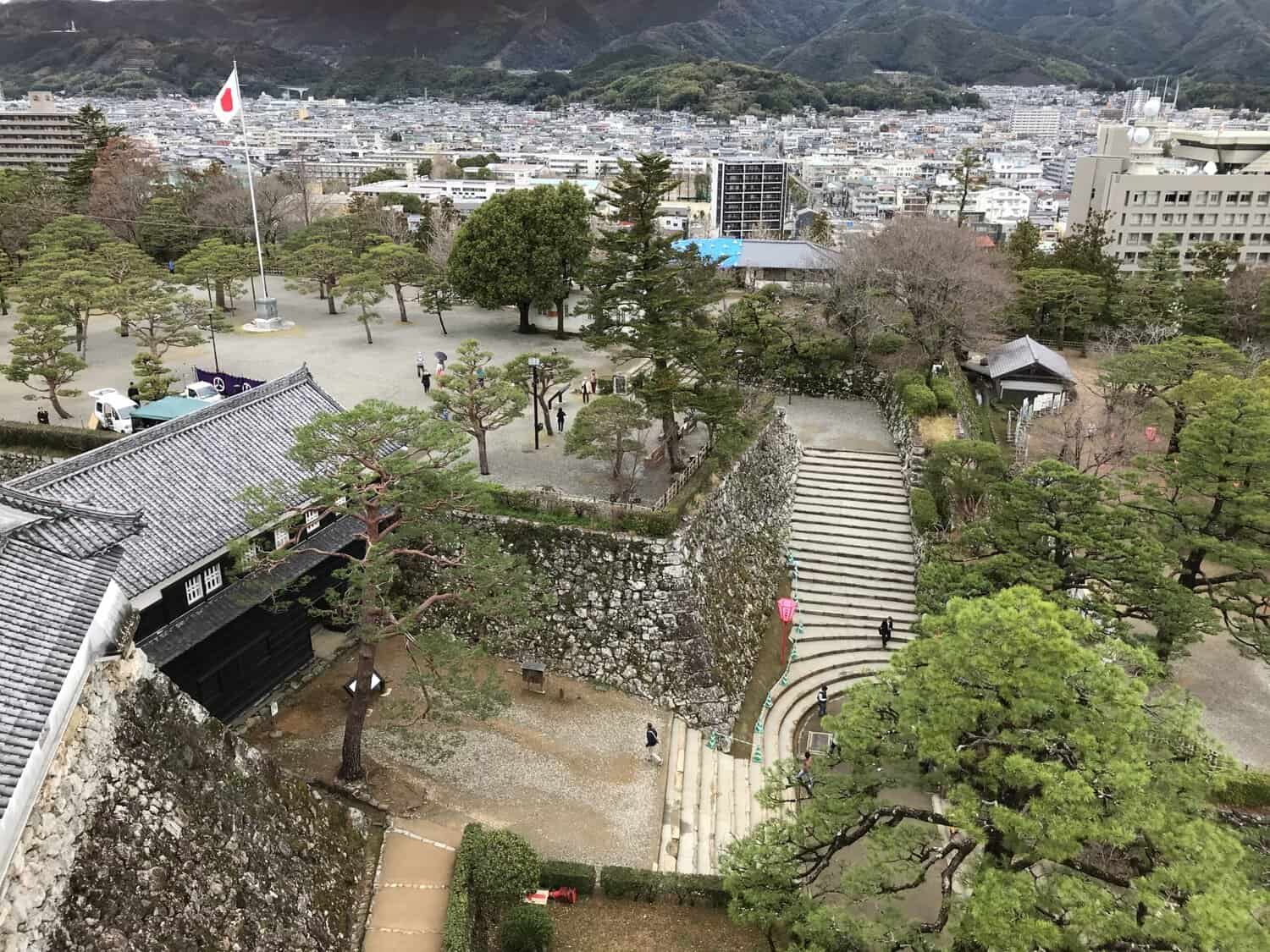 By the time we were done with lunch the rain had stopped, although the sky was still very overcast and gloomy. The perfect backdrop for climbing up the hill to get to Kochi Castle. The castle was well designed to keep invaders out, including tourists who have already met more than their FitBit quota for stair climbing for the day.